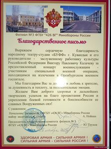Участники народного театра-студии "Буфф" и ВИА "БУФФет" выступили перед ранеными, находящимися на излечении в военном госпитале г.Оренбурга. В этот же день юные артисты дали концерт для отдыхающих пансионата "Марсово поле", где также поправляют здоровье родители участников СВО. В программе прозвучали патриотические песни, песни Владимира Высоцкого, лирические и популярные композиции современных авторов.